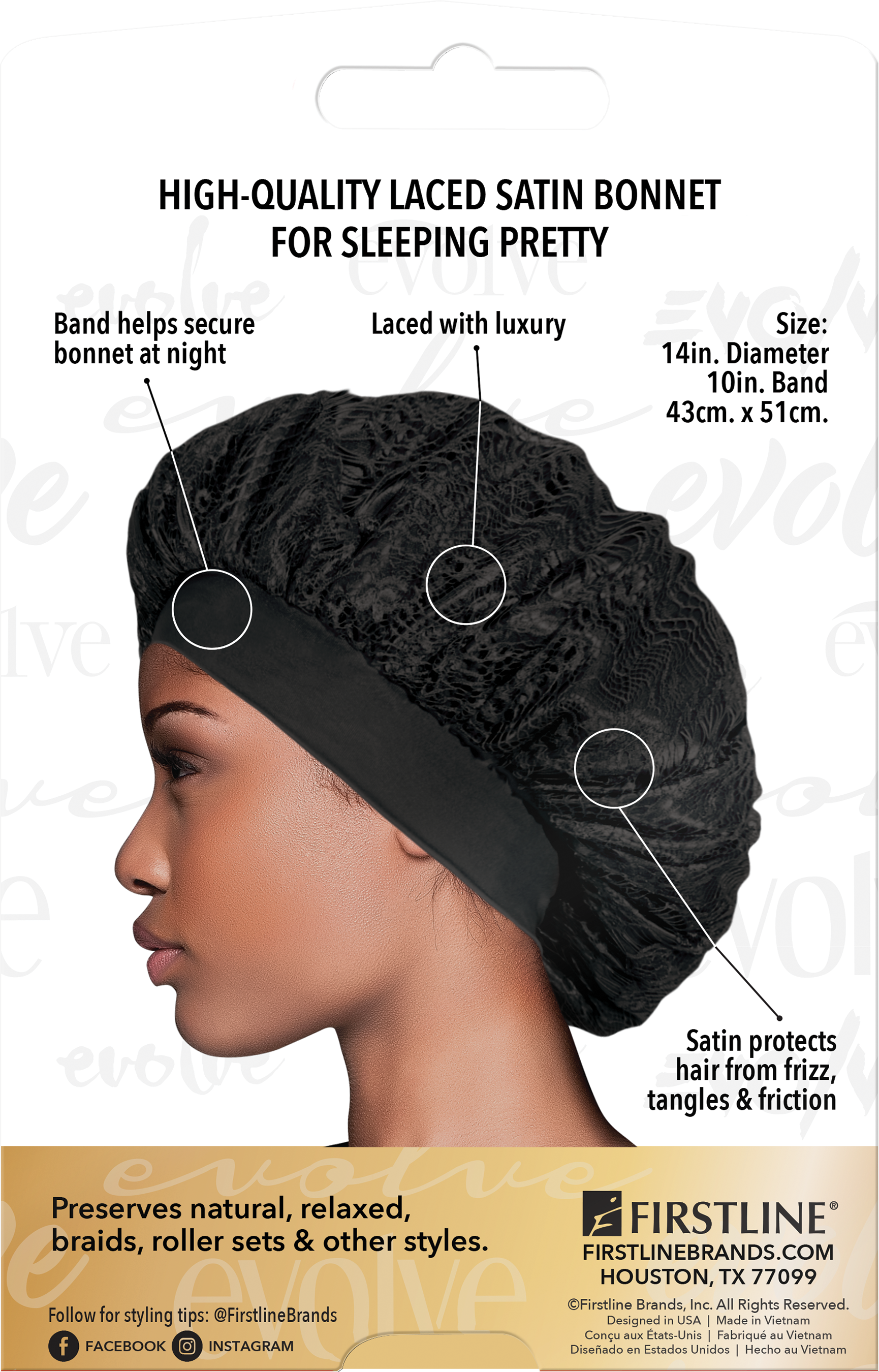 With the Evolve Laced Satin Wide-Edge Bonnet in Black, prepare to wake up to hair that's as refreshed and beautiful as you are. This bonnet isn't just a tool; it's a nightly beauty ritual that pampers your hair, ensuring you rise with tresses as graceful and poised as your spirit.